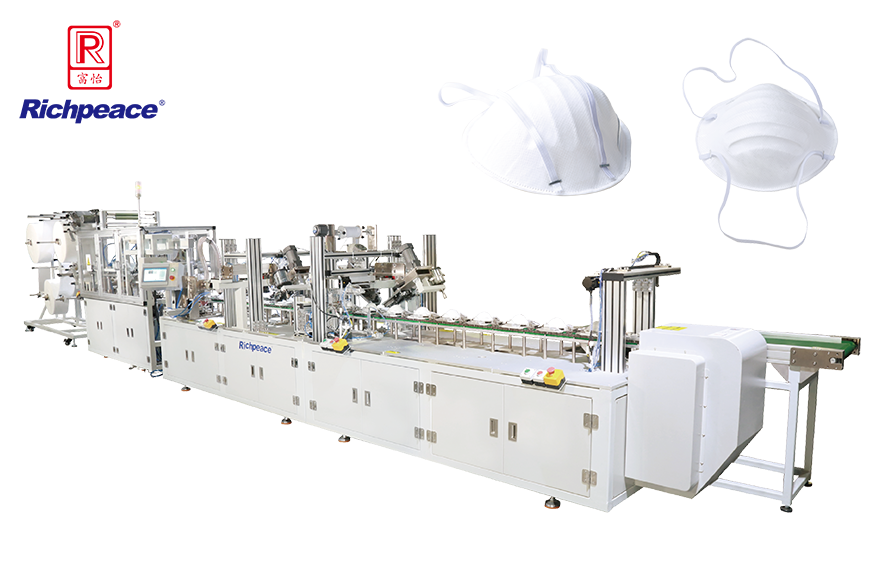星空全自动罩杯口罩生产线,又名罩杯口罩机,一体式设计 , 从原料进入 , 罩杯成型,罩杯周边焊接,罩杯周边冲切,自动传输,贴外置鼻夹 , 自动移印 , 自动金属钉头带(可选自动焊接头带), 自动超声波上呼吸阀(选配),机械手抓取,自动传输等工艺自动完成,实现罩杯式口罩的全自动生产。恒温感应自动贴外置鼻夹 , 切口圆滑 , 贴合牢固。自动移印装置 , 高效快捷 , 图案清晰。自动双向金属钉头带装置,耳带长短可调 , 牢固 , 拉力强。成品废料自动分离。