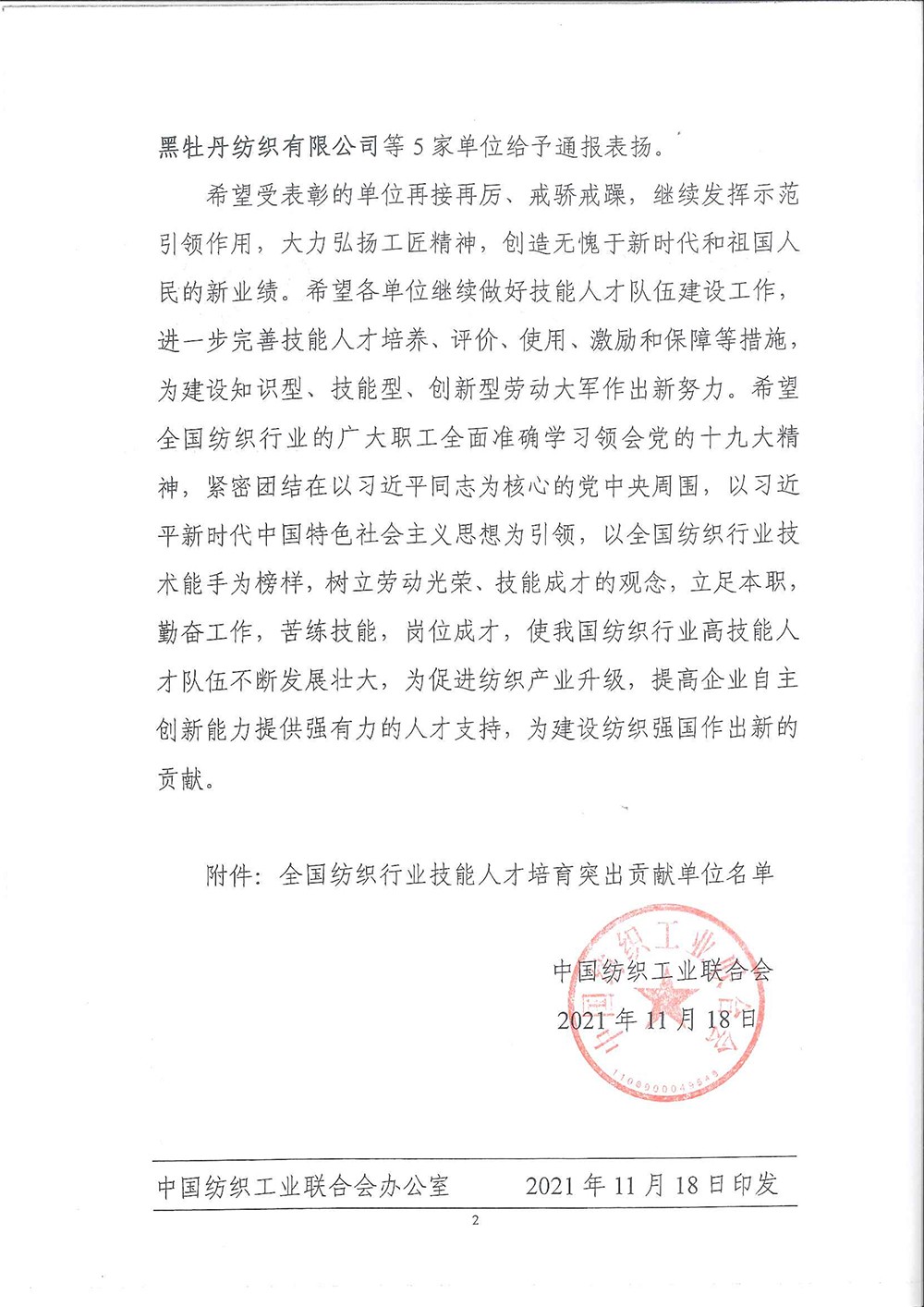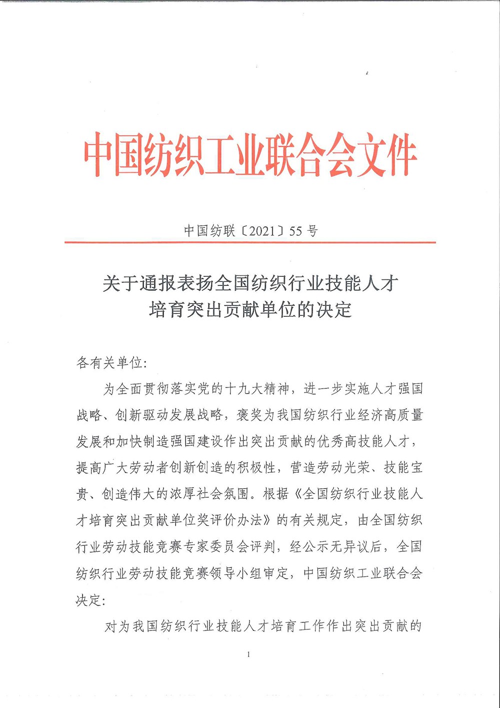 热烈庆祝星空被评为“2021全国纺织行业技能人才培育突出贡献单位”