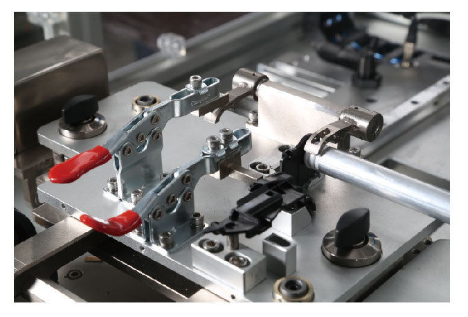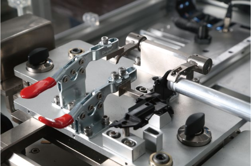 1、采取定位销加1/4旋钮配合实现工装的快换,随形定位功能,工装放置更为方便,气动夹钳实现工装的自动压紧。