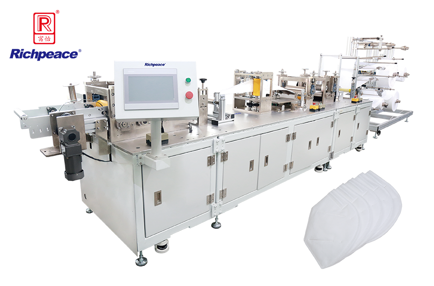 1.1-6 层面料自动对齐入料、鼻梁条剪切推送(选配)、花辊压花、自动喷印(选配)、对折入料、封边、套切到引料导出全流程自动化打片作业。