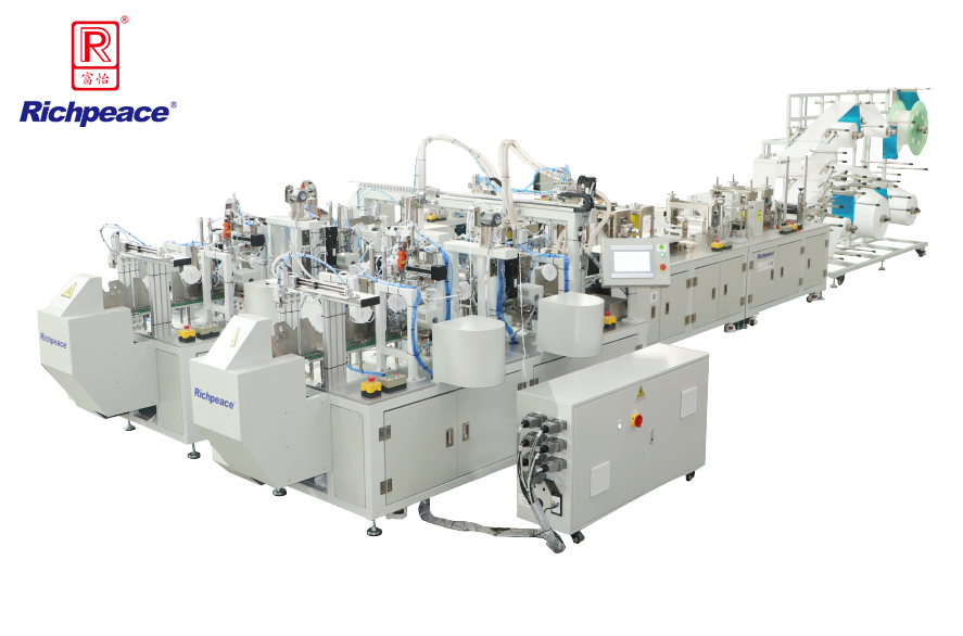 2、分体式设计,面层、滤层、底层3-6卷面料自动对齐入料,自动嵌入鼻梁条,自动喷印LOGO,切割成型,自动抓取口罩片及分流,口罩片传输、头带焊接、口罩成品出料全自动化控制。